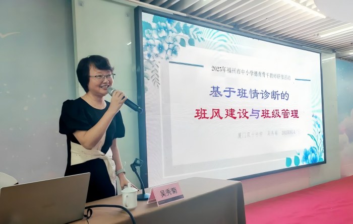 浙江丽水市德育专家、教学名师、高级教师朱德飞以《新时代学校德育顶层设计:领导力、德育力、融合力的浙江实践与福州启示》为题,分享了杭州、丽水、福州等地的德育工作实践经验,为学员们在实践中提升德育专业能力提供了借鉴。
